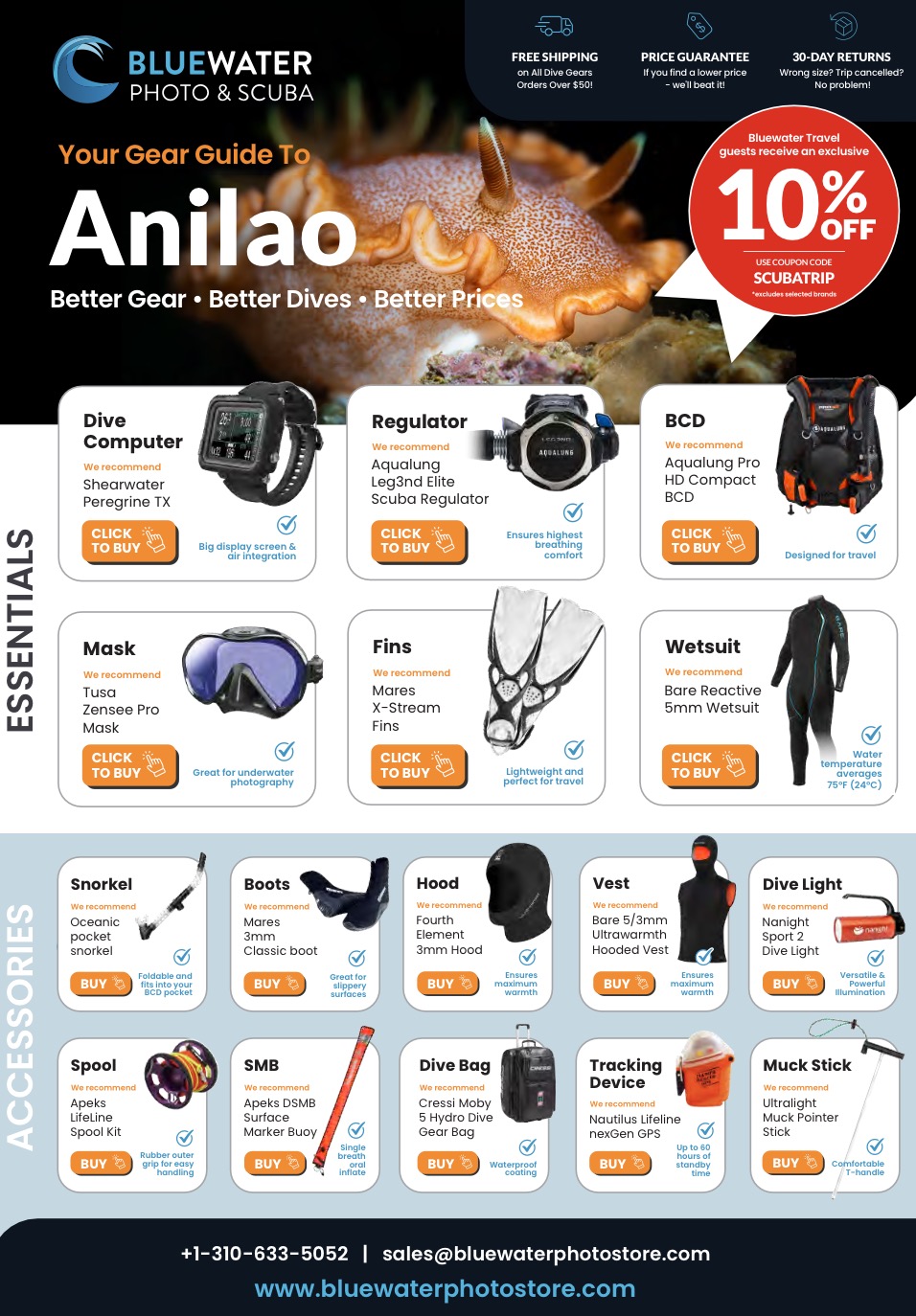 Download our full scuba gear guide to Anilao December, Bluewater Travel guests receive 10% OFF! Click the image below to download (PDF).