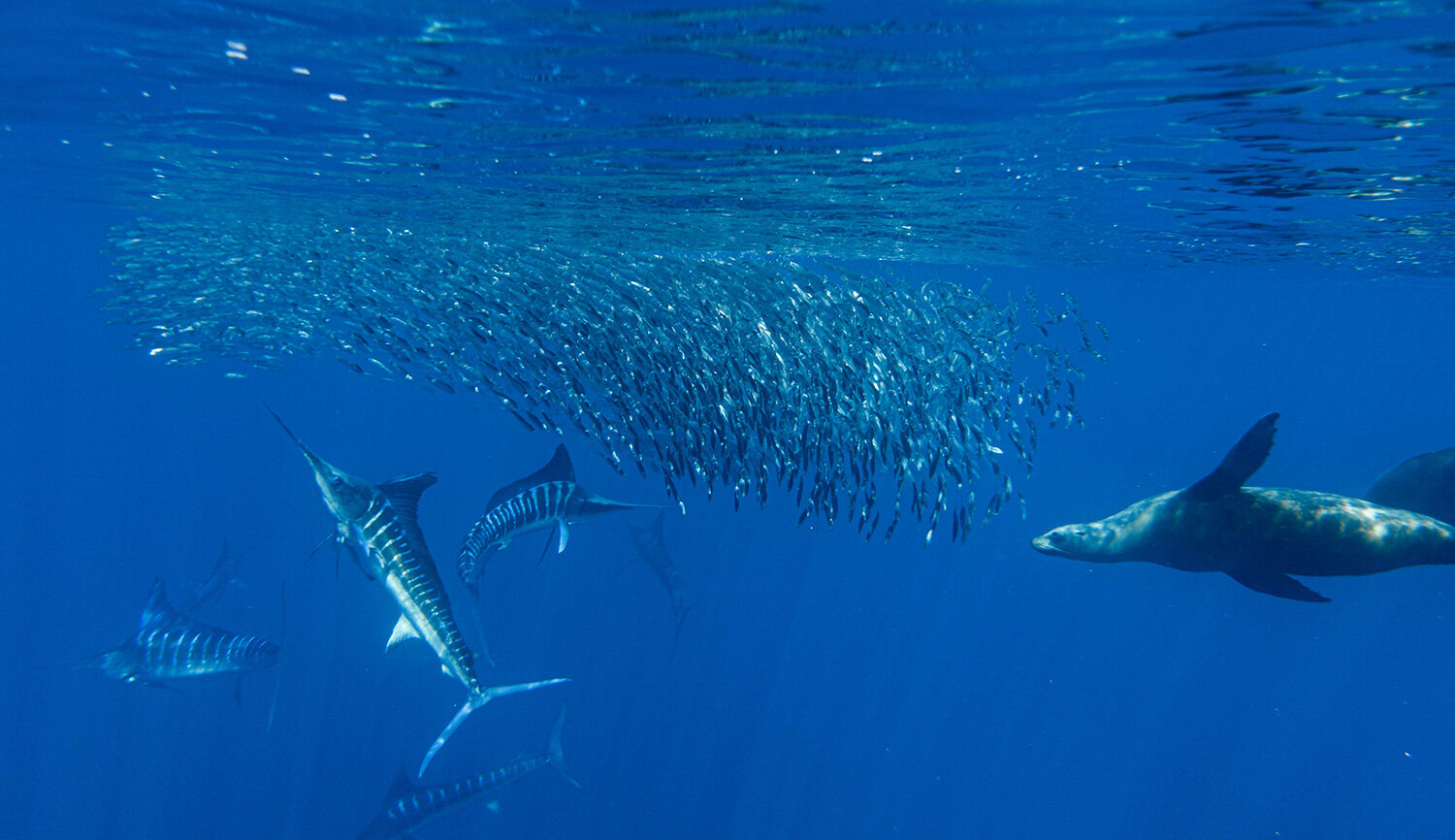 Join Bluewater Travel for one of the most thrilling big-animal experiences in the Pacific, encountering striped marlin hunting bait balls during the sardine run in Magdalena Bay.