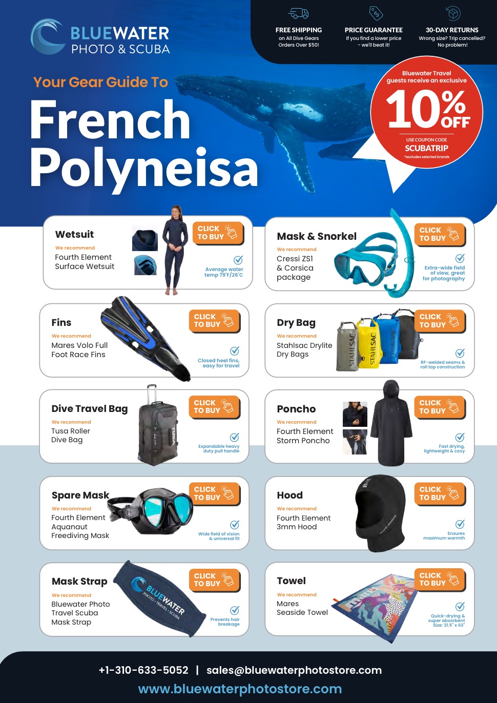 Download our full scuba gear guide to French Polyneisa humpback whale snorkeling, Bluewater Travel guests receive 10% OFF! Click the image below to download (PDF).