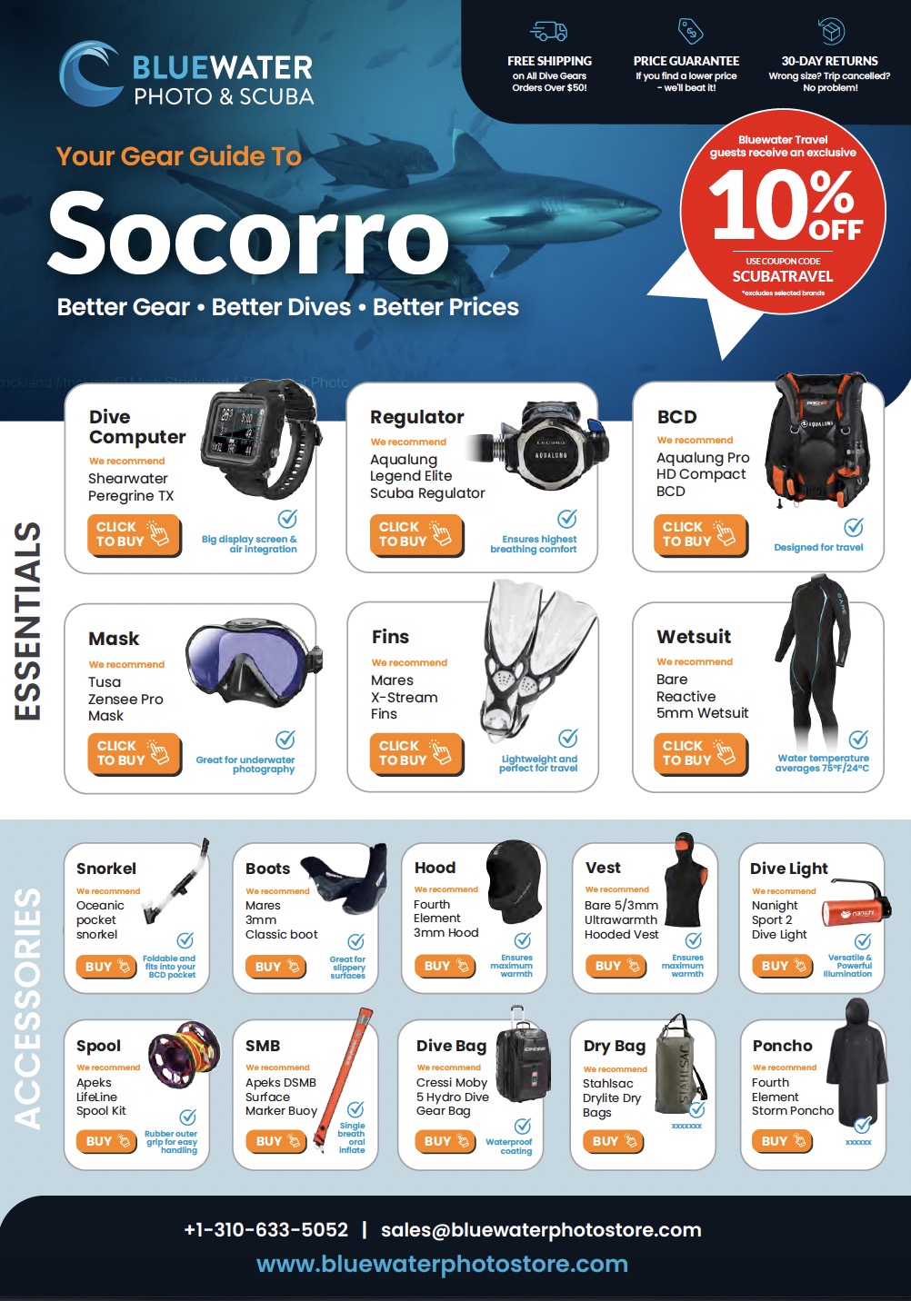 Download our full scuba gear guide to Socorro, Bluewater Travel guests receive 10% OFF! Click the image below to download (PDF).