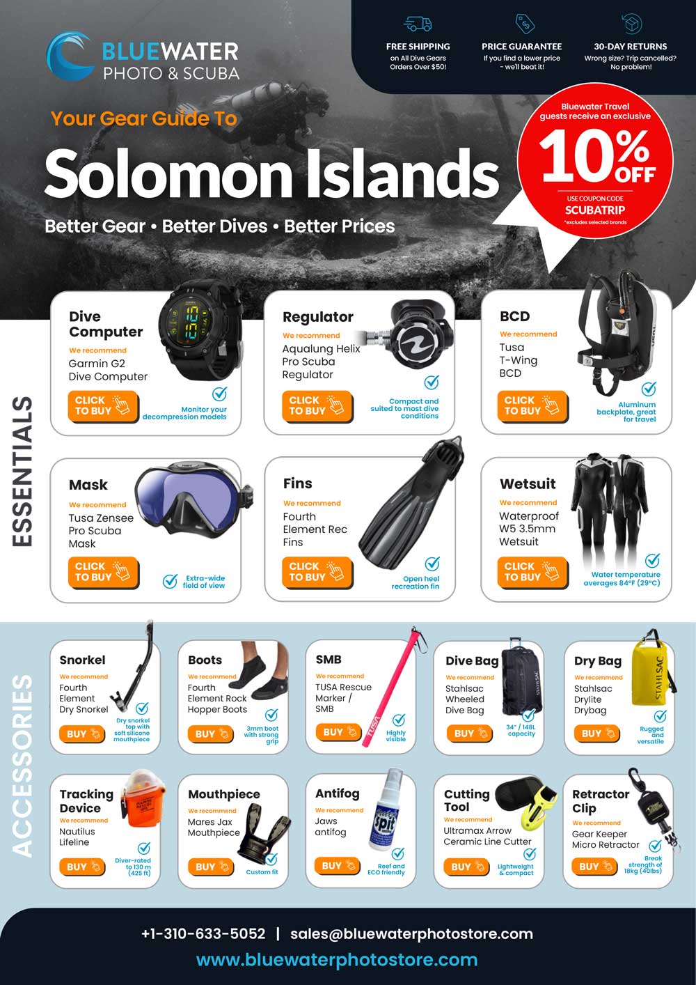Download our full scuba gear guide to Solomon Islands, Bluewater Travel guests receive 10% OFF! Click the image below to download (PDF).