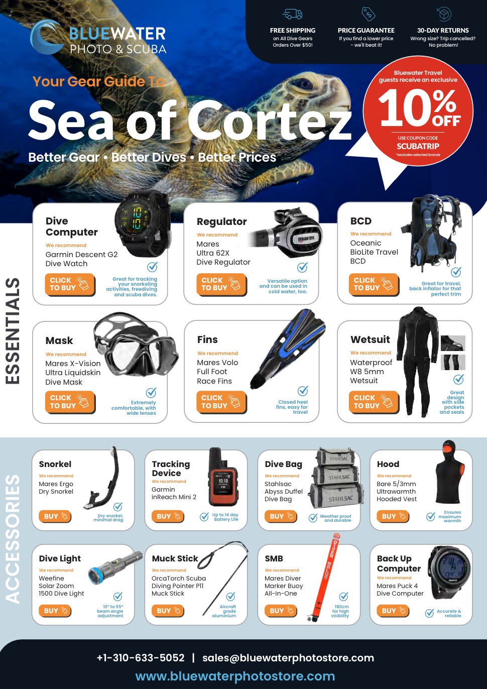Download our full scuba gear guide to Sea of Cortez, Bluewater Travel guests receive 10% OFF! Click the image below to download (PDF).
