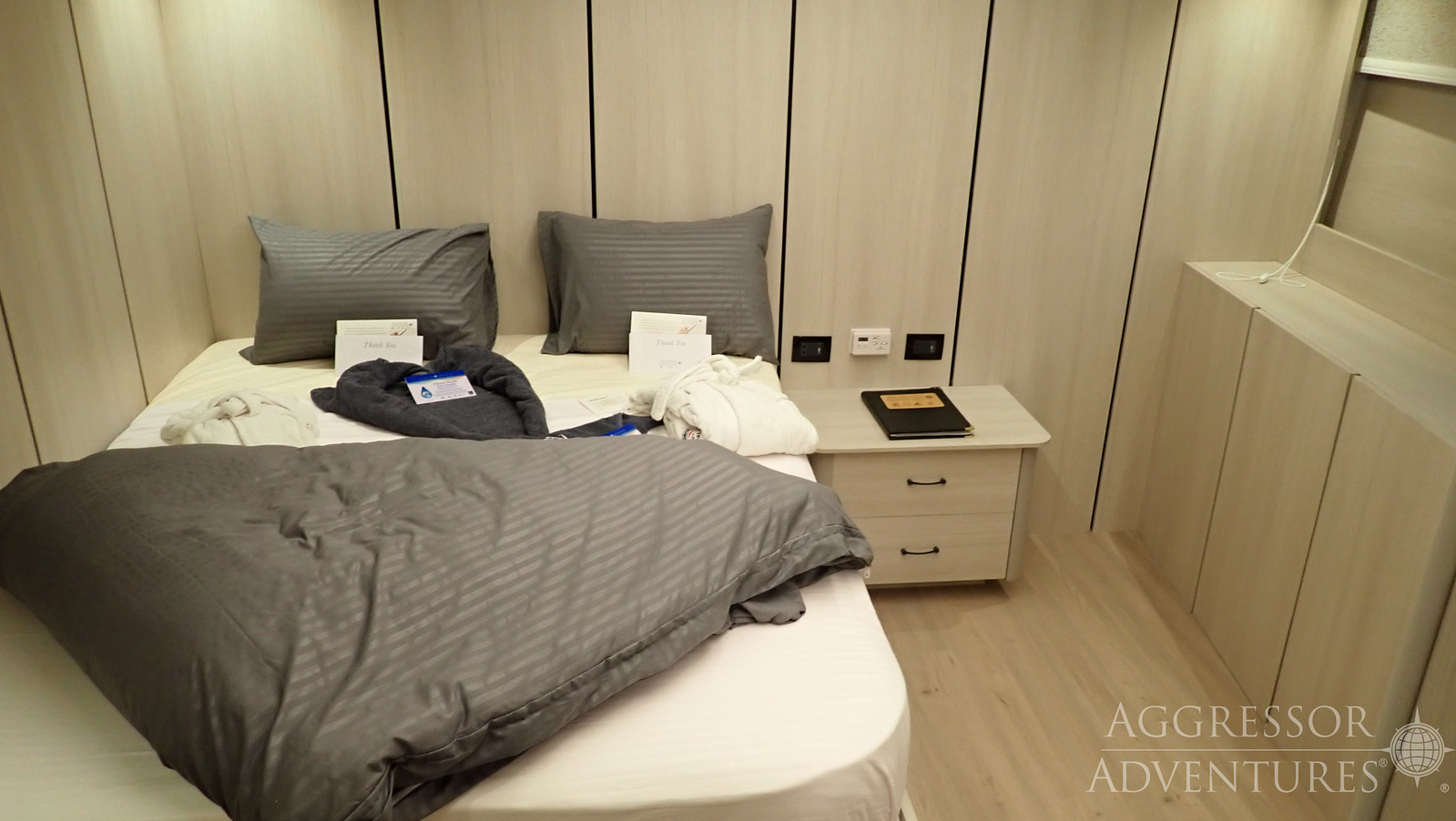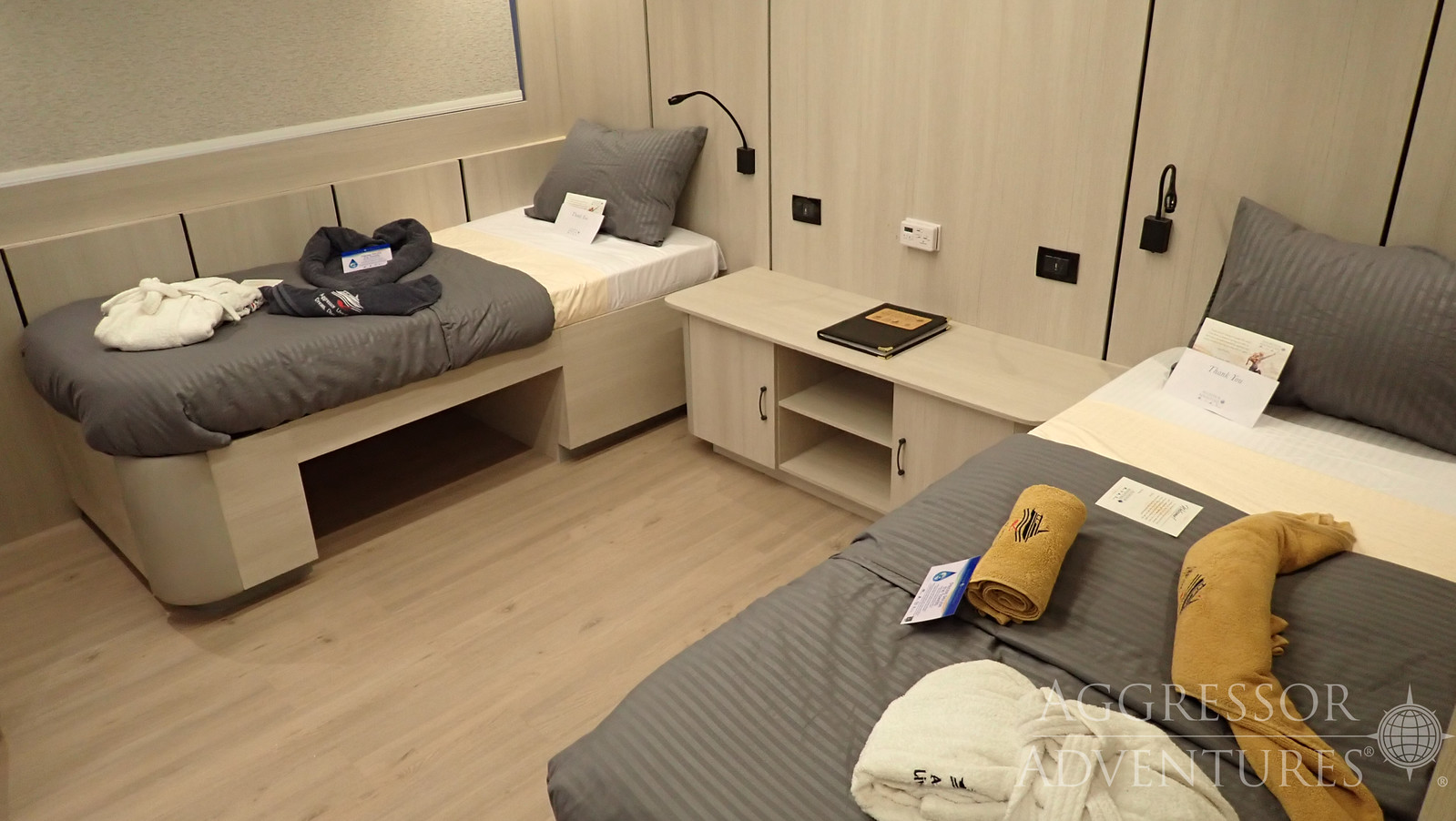 The Red Sea Aggressor V accommodates up to 26 guests in 13 air-conditioned staterooms, each featuring a private bathroom, fresh towels, a hairdryer, a mini-fridge, a safety deposit box, and a TV/media player for reviewing underwater footage. Options include four Master staterooms with queen beds and portholes, as well as nine Deluxe staterooms—four with convertible twin-to-king beds and a mix of portholes or picture windows, and five with twin beds and picture windows. Designed for comfort and functionality, these staterooms provide a relaxing retreat after a day of diving adventures.