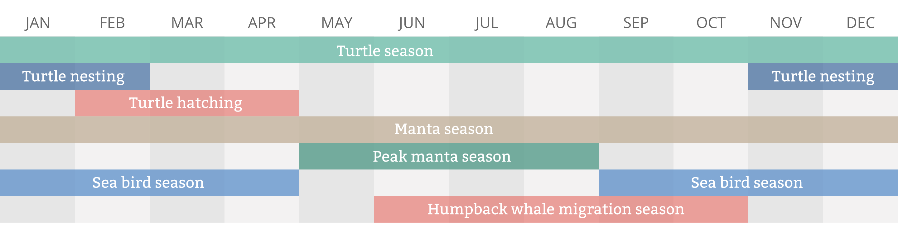 Lady Elliot Island offers a rich mix of wildlife encounters both above and below the water. Snorkelers and divers can see manta rays year-round, with peak aggregations in winter, alongside green, loggerhead, and hawksbill turtles that nest and hatch between November and April. The surrounding reef also hosts seasonal coral spawning and is frequented by migrating humpback whales from June to October. Above the water, the island transforms into a bird sanctuary between September and March, with thousands of seabirds nesting, while resident and visiting species can be seen year-round.